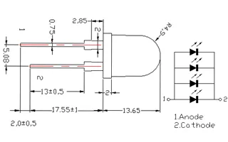 Выводной круглый мощный светодиод, d=10 мм, прозрачная линза. Цвет свечения красный (620-630 нм), 4 кристалла. Угол излучения 20°. Световой поток 8-12 лм при If=80 мА. VF=2-2.6 В.