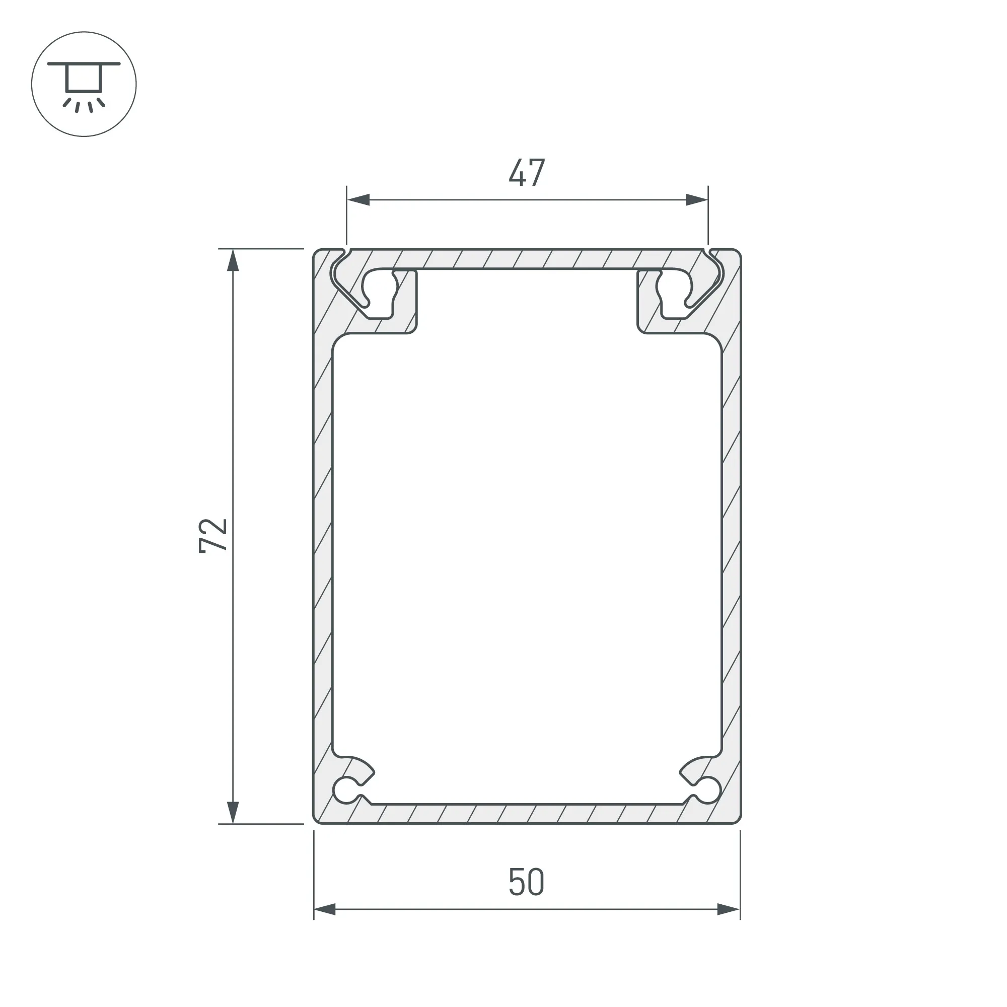 Алюминиевый профиль без экрана, для использования в качестве основания для светильников и отсека для блока питания. Состоит из 2-х частей - основания и верха, фиксация силиконовым шнуром (в комплекте). Отсек для БП 29х56мм. Габаритные размеры (L×W×H): 2000x50x72 мм. Заглушки и другие аксессуары приобретаются отдельно. Цена за 1 метр.