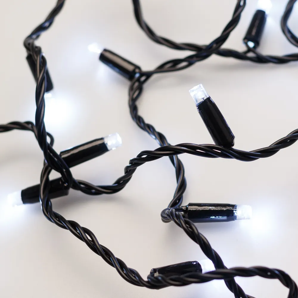 Светодиодная нить Classic. Размер 10000 мм. Цвет свечения БЕЛЫЙ (6000 К). 100 светодиодов размером 7 мм со статическим эффектом свечения с резким световым рисунком (прозрачная вогнутая линза). Провод черный, ПВХ. Питание 230 В, Мощность 7 Вт, защита IP65, применение в помещении и на улице под навесом. Аксессуар для подключения приобретается отдельно.