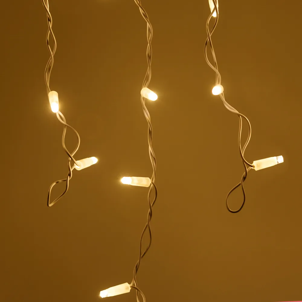 Светодиодная бахрома Pro. Размер 5600x900 мм (длина 5600 мм, по длине 48 нитей высотой 200/900 мм). Количество светодиодов 240 шт размером 7 мм. Цвет свечения ТЕПЛЫЙ БЕЛЫЙ (3000 К), эффект постоянного свечения с резким световым рисунком (прозрачная вогнутая линза). Провод белый, резиновый. Питание 230 В, Мощность 15 Вт, защита IP65, применение на улице под навесом. Аксессуары для подключения приобретаются отдельно.