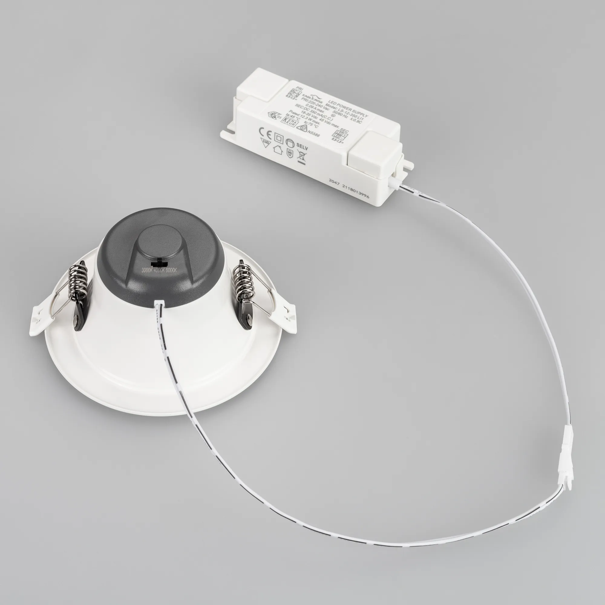 Светильник даунлайт с изменяемой цветовой температурой и переключателем на корпусе. Мощность 10 Вт, св. поток 880 лм, 88 лм/Вт, белый 6000К, или дневной 4000К, или теплый 3000К (выбор цвета свечения при установке, фиксированный), CRI>80, угол 80°, напряжение питания 230 В. Белый круглый корпус из алюминия, степень защиты IP20. Размер: диаметр 113 мм, высота 59 мм. Монтаж встраиваемый, установочное отверстие: диаметр 90-102 мм. Драйвер 18-35 В, 350 мА, пульсация <0,7%.