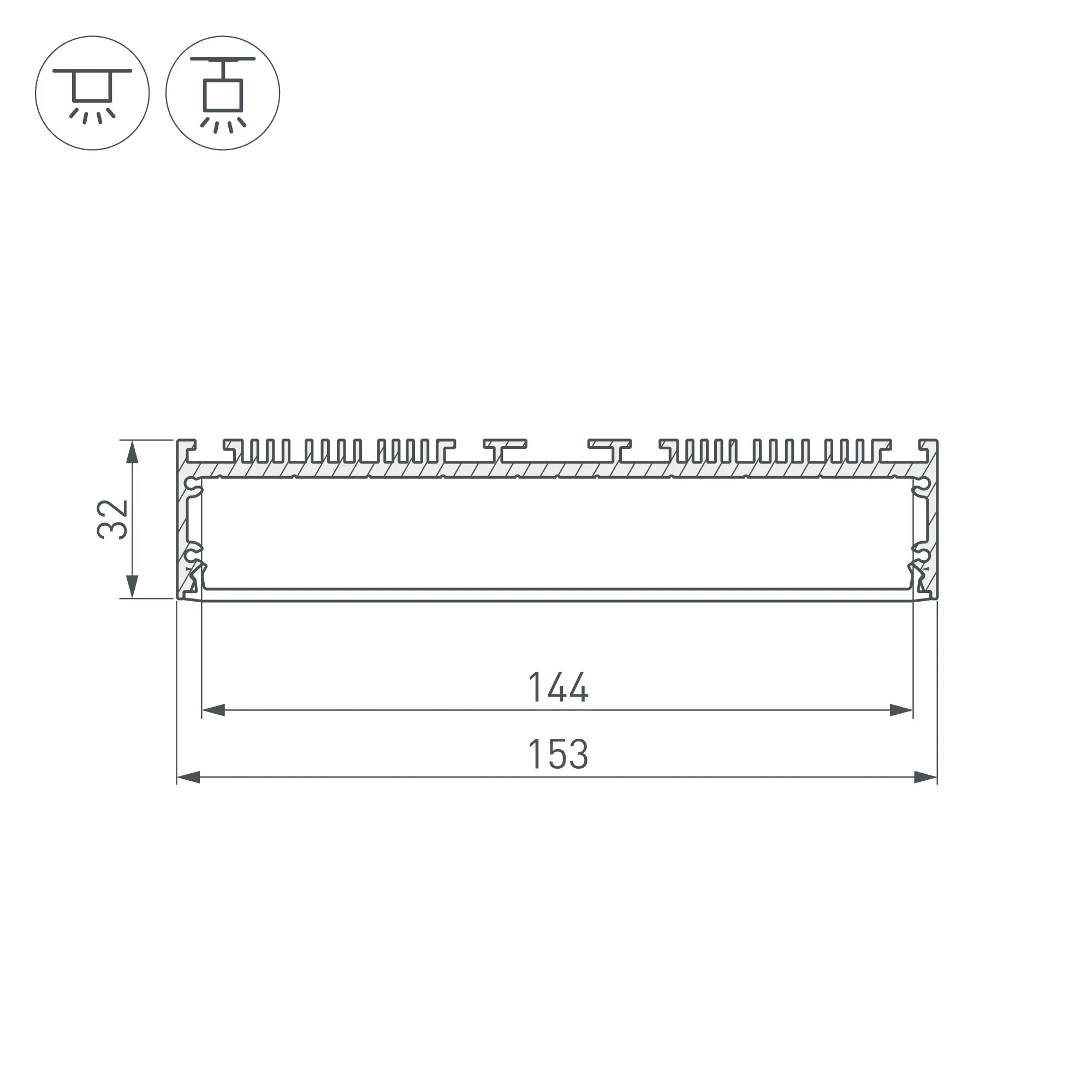 Алюминиевый анодированный профиль для светодиодных лент и линеек. Габаритные размеры (L×W×H): 2000x153x32 мм. Ширина площадки для ленты 144 мм. Экраны, заглушки и другие аксессуары приобретаются отдельно. Цена за 1 метр.