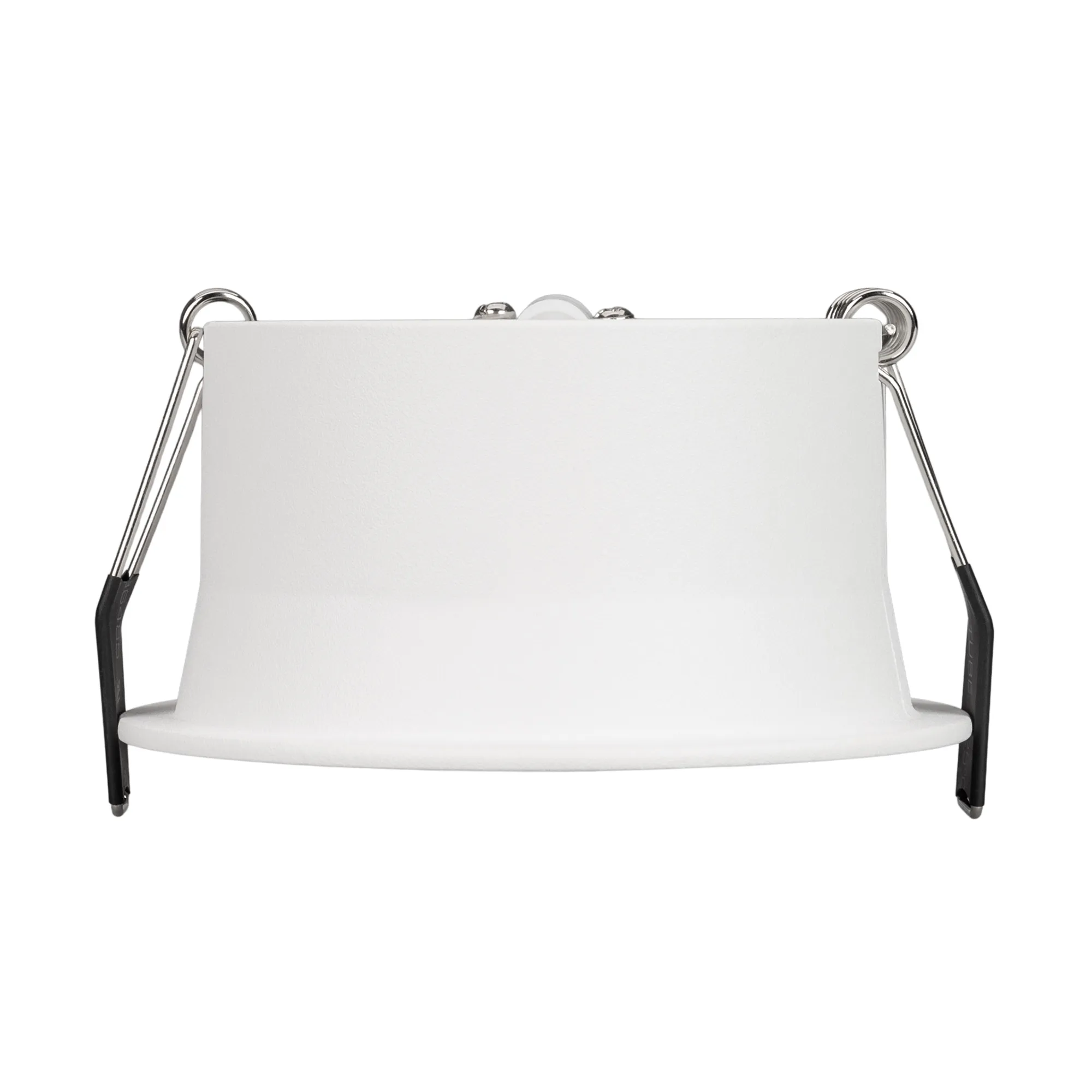 Встраиваемый светильник даунлайт. Мощность 12 Вт, св. поток 840 лм, 70 лм/Вт, тёплый 3000 K, CRI>90, угол 90°, напряжение питания 230 В. Белый круглый корпус из алюминия, степень защиты IP20. Размер: диаметр 104 мм, высота 55 мм. Монтаж встраиваемый, установочное отверстие: диаметр 95 мм. Драйвер 27-42 В, 300 мА, пульсация <2%.