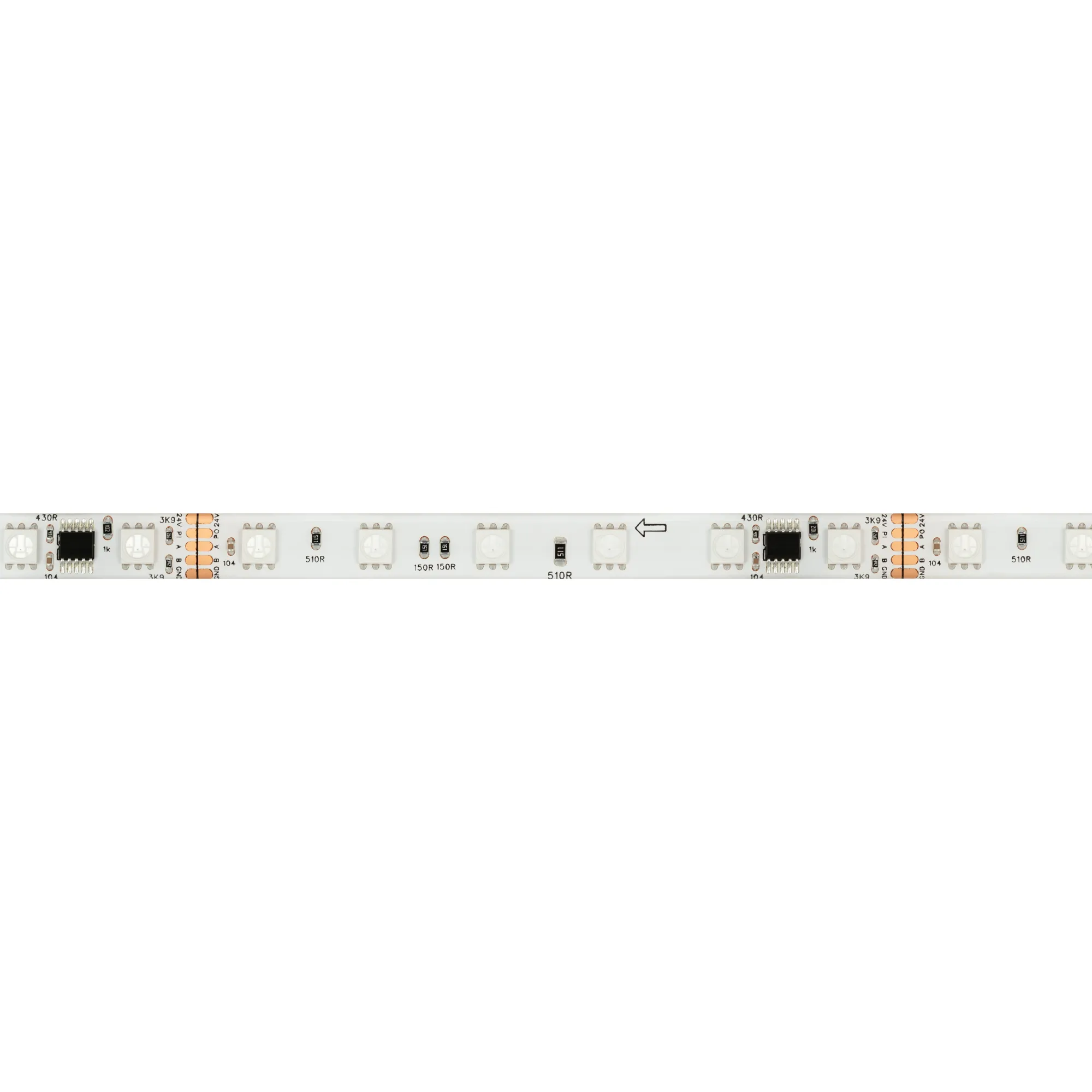 Светодиодная герметичная лента DMX серии B60 с микросхемой GS8526, IP65 (SE - силиконовый верхний слой). Светодиоды SMD 5060, 60 шт/м, 10 pixels на 1 м (50 pixels на 5 м), 1 pixel = 6 светодиодов, белая плата шириной 10 мм, скотч 3М. Цвет RGB, угол 120°. Питание 24 В, мощность 14 Вт/м (70 Вт на 5 м). Размеры 5000x10x4 мм. Мин. отрезок 100 мм, 6 светодиодов. Цена за 1 м.