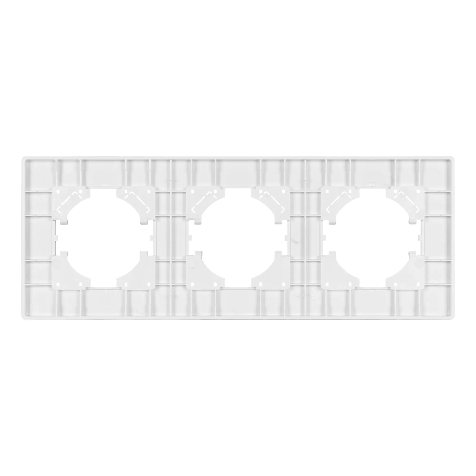 Рамка пластиковая на 3 поста, под встраиваемый механизм. Цвет - белый. Уровень герметичности IP20. Ориентация монтажа - горизонтальная (основным ориентиром служат посадочные выступы для накладки механизма).