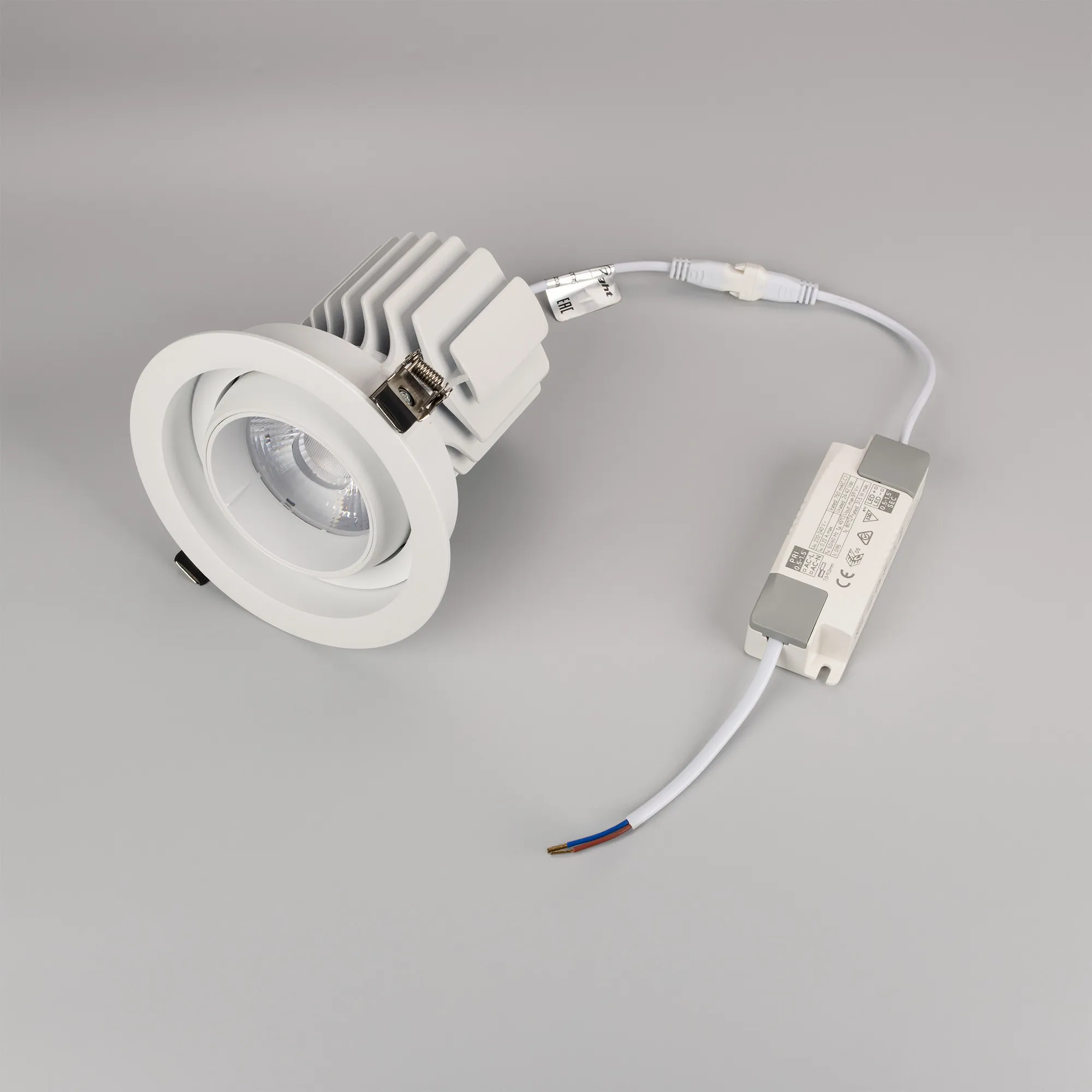 Встраиваемый карданный светильник. Мощность 30 Вт, св. поток 3104 лм, 102лм/Вт, тёплый 3000 K, CRI>92, угол 17°, напряжение питания 230 В. Белый корпус из алюминия, белая вставка, степень защиты IP20. Размер: диаметр 135 мм, высота 125 мм. Монтаж встраиваемый, установочное отверстие: диаметр 120 мм. Драйвер 24-42 В, 750 мА, пульсация <2%.