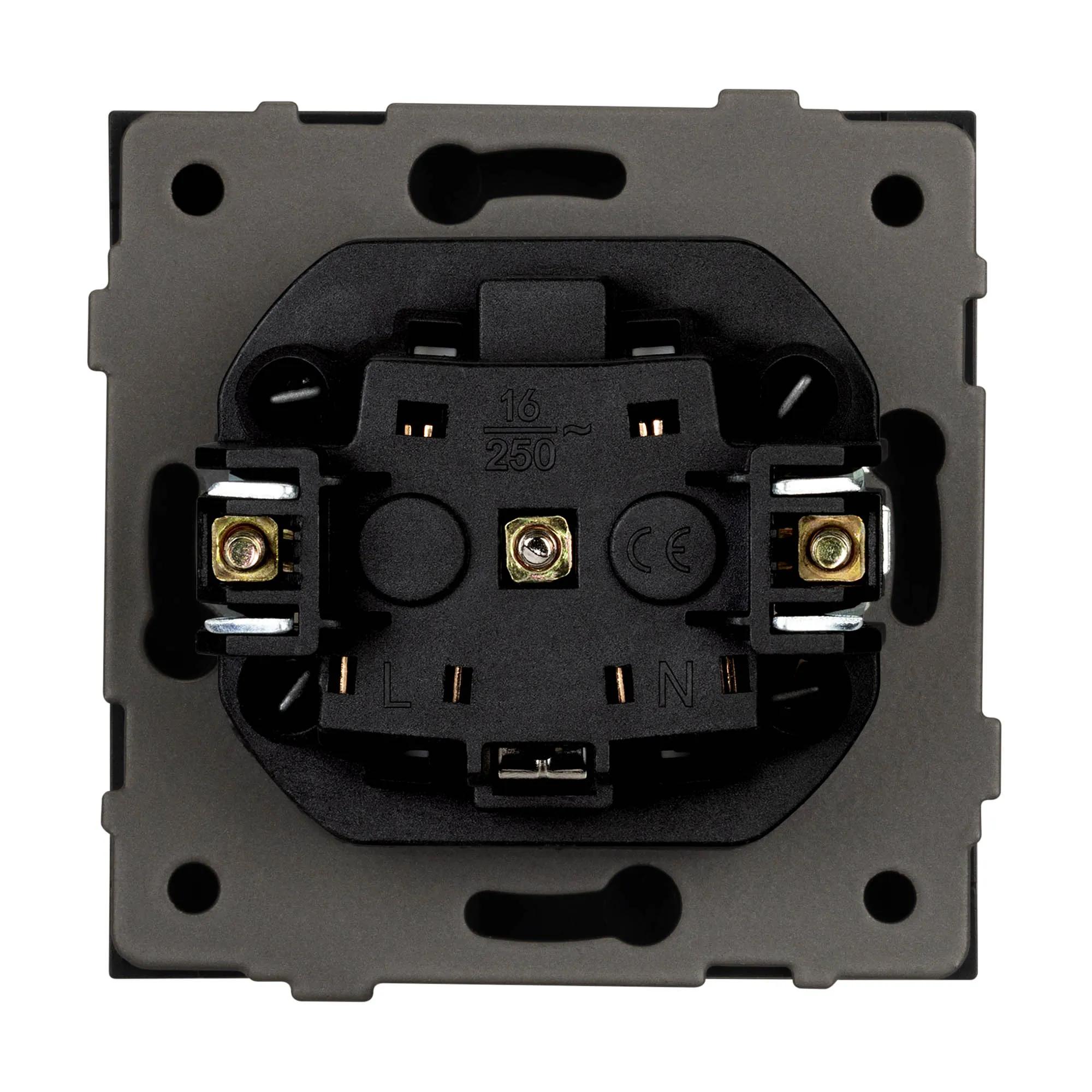 Механизм розетки с заземлением и влагозащитной крышкой на 1 пост. Цвет - матовый черный, с Soft-Touch покрытием. Без фронтальной рамки. Уровень пылевлагозащиты IP44. Розетка устанавливается в стандартный подрозетник круглого сечения диаметром 60мм.