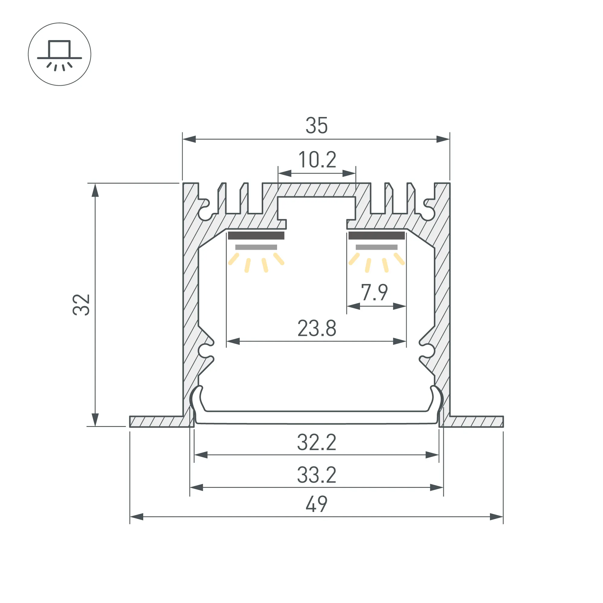 Алюминиевый анодированный профиль для светодиодных лент и линеек. Габаритные размеры (L×W×H): 2000x49x32 мм, паз для установки 35 мм. Ширина площадки для ленты 23,8 мм. Экраны, заглушки и другие аксессуары приобретаются отдельно. Цена за 1 метр.