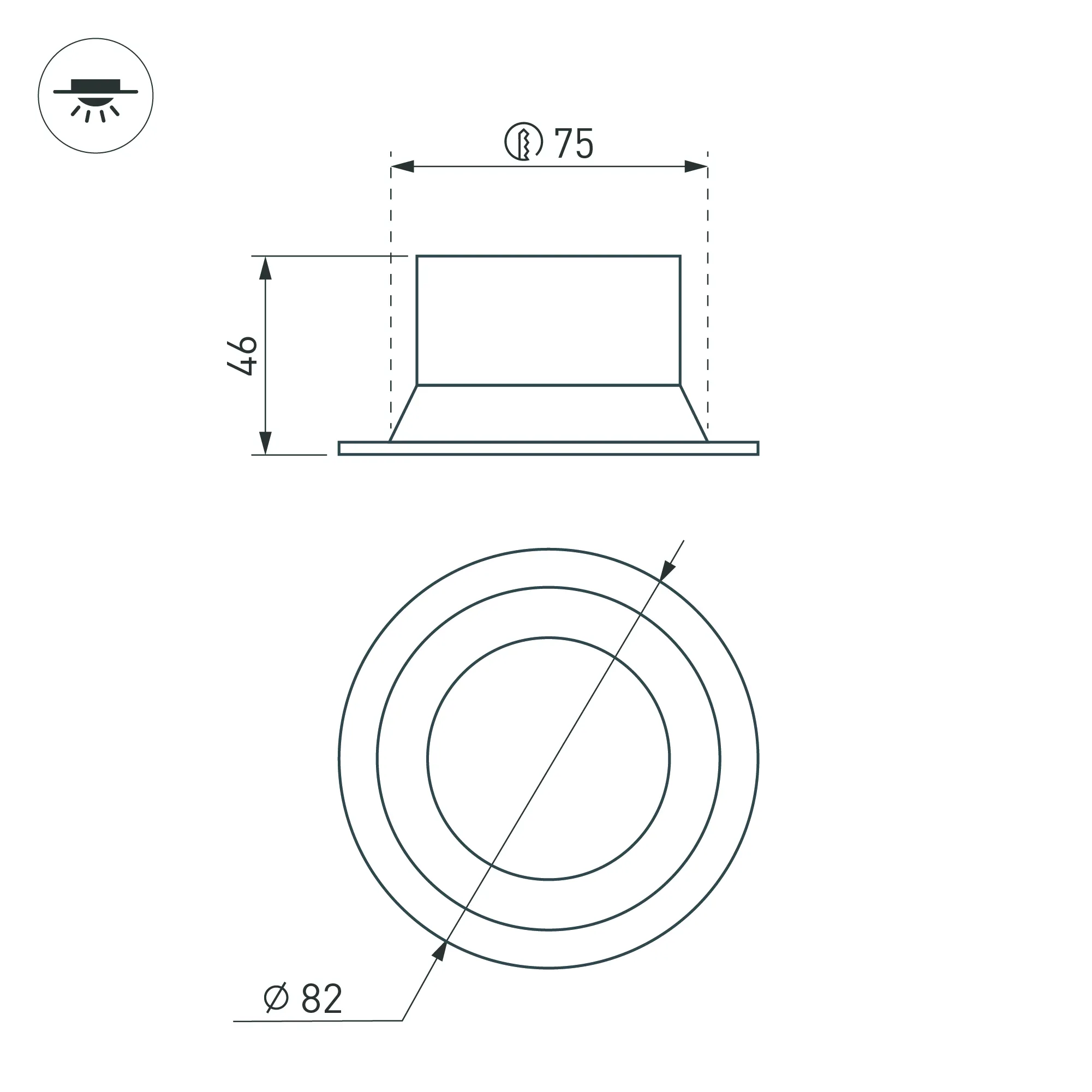 Встраиваемый светильник даунлайт. Мощность 9 Вт, св. поток 595 лм, 66 лм/Вт, дневной 4000 K, CRI>90, угол 85°, напряжение питания 230 В. Белый круглый корпус из алюминия, степень защиты IP20. Размер: диаметр 82 мм, высота 46 мм. Монтаж встраиваемый, установочное отверстие: диаметр 75 мм. Драйвер 27-42 В, 200 мА, пульсация <2%.