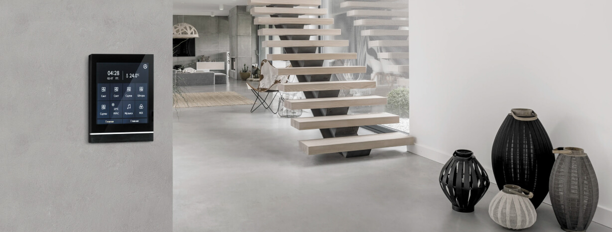Многофункциональные настенные панели стандарта управления KNX за счет встроенных датчиков температуры, освещенности и приближения позволяют реализовать самый сложный алгоритм работы.