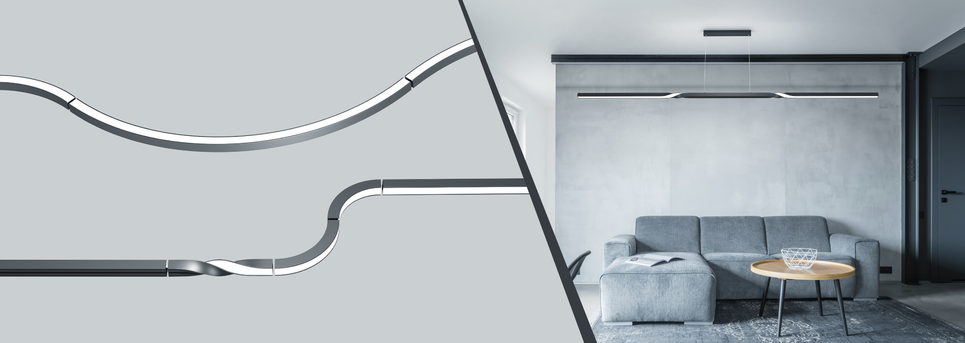 Вторая часть новинок этой серии — профили TWIST, скрученные вправо и влево на 90 или 180°. С их помощью можно менять направление свечения светильника, что позволяет составлять всевозможные комбинации из профиля и создавать действительно уникальные интерьерные решения. Для скрученных профилей созданы специальные широкие светодиодные ленты RT-A140 шириной 20 мм. За счет особой конструкции лента может легко скручиваться без деформации и сдвига на скрученных участках профиля.